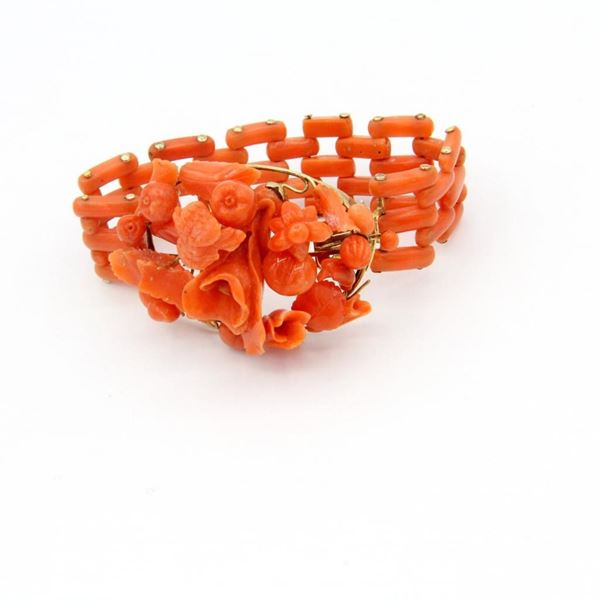 A very well-preserved coral and 18 carats gold bracelet with a beatiful linked by beautifully ornamental motifs engraved. Gross weight 31 grams