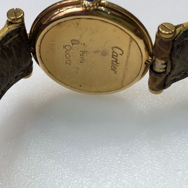Quartz movement, white dial Black Roman numerals hour markers, original clasp deployante signed by Cartier.