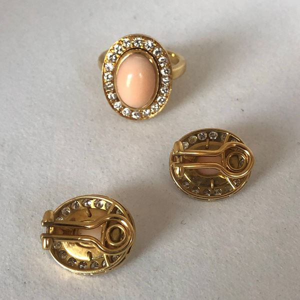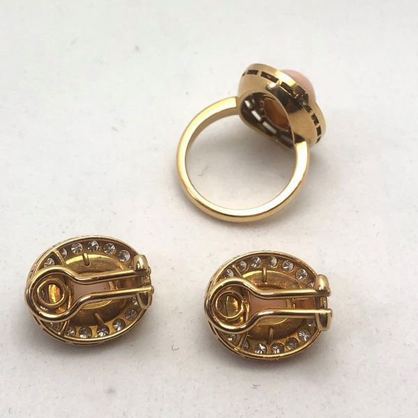 Earrings set with central coral cabochon surrounded by 0,80 carats of brilliant-cut diamonds