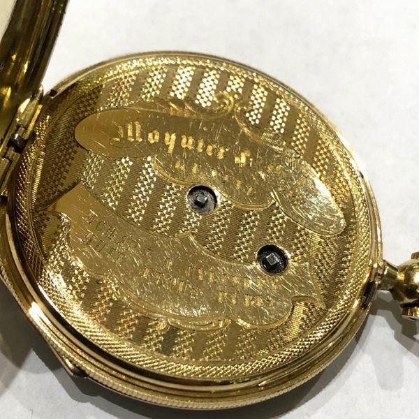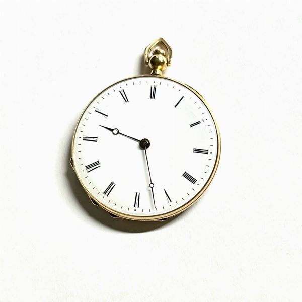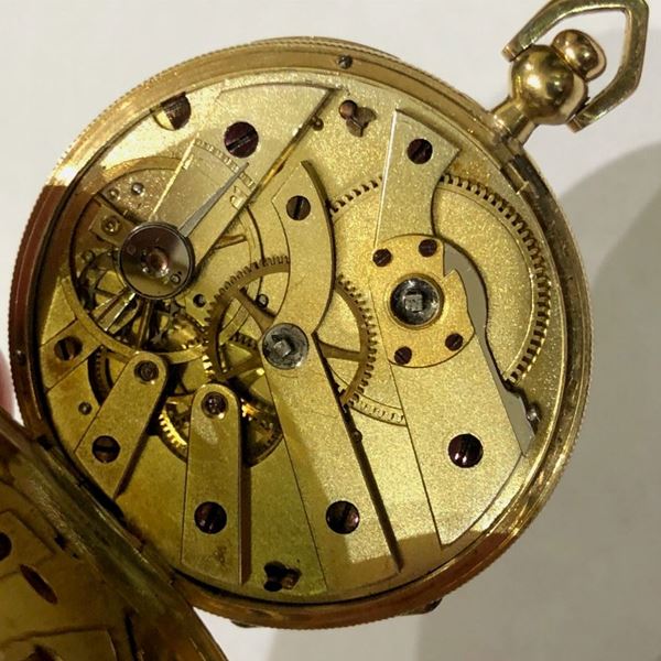 Very nice open-face pocket watch in 18 kt yellow gold with case engine turned hinged, key WIND movemen tgilt cylinder , 3 arm balance Dial and cuvette signed And numbered Diameter 37 MM Gross weight 27,90