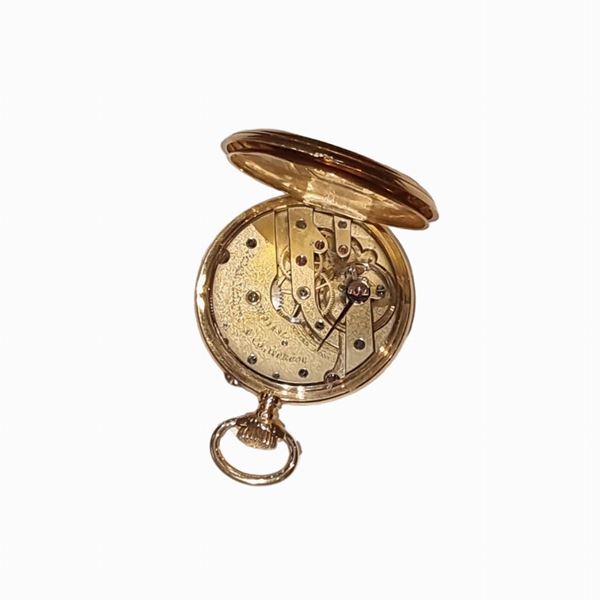 A well-preserved open-face pocket watch in rose gold 18 kt , Keyless movement, white dial with black Roman numerals hour markers, three body case Dial, case and movement Signed Diameter 45 mm