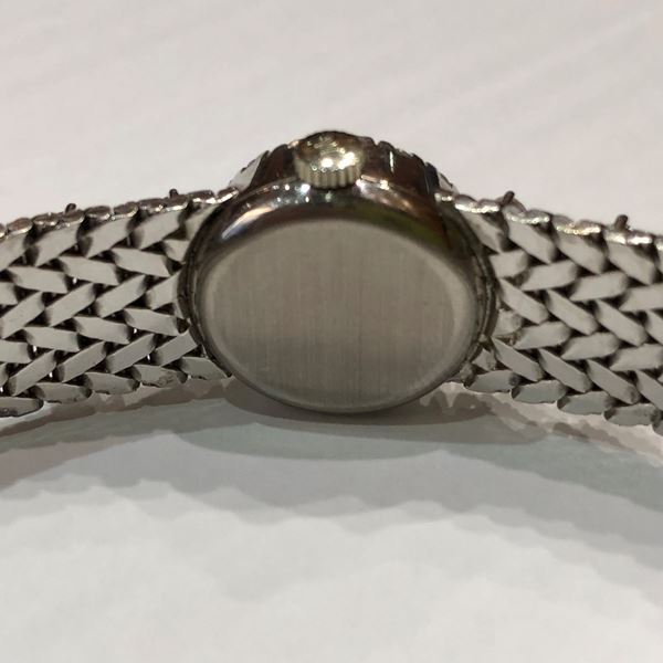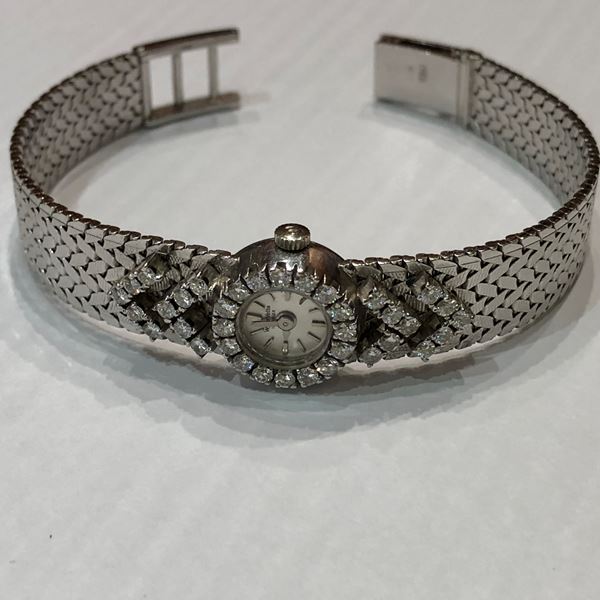 A   lady-watch in white gold 18 kt, round shape, case snap on back And decorated with brilliant-cut diamonds weighing approximately 2 carats. Manual winding movement, silvered dial with baton hour markers applied, original bracelet integrated with folding clasp deployante signed
