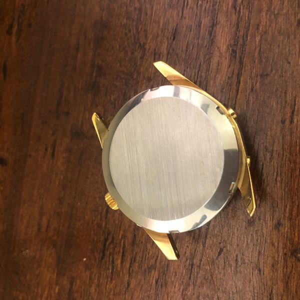 A very well-preserved stainless steel and goldfield wristwatch, round shape, case back screw-down, Automatic movement, white dial with moon phase and aperture for day and month at 12, Arabic numerals alternated hour markers, subsidiary hand for date