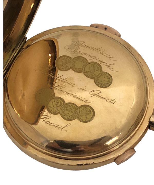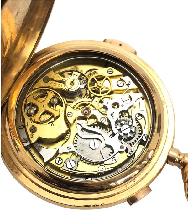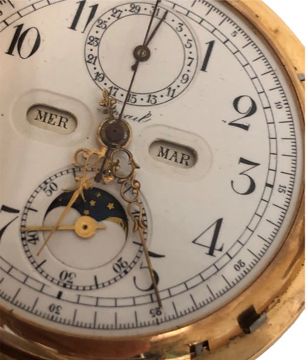 A well-preserved pocket watch with chronograph function and quarter repeater in yellow gold 18 kt, manual winding movement, white dial Quantieme et phase de lune, day and month aperture, two subsidiary dials recording date and seconds, moon phase.
