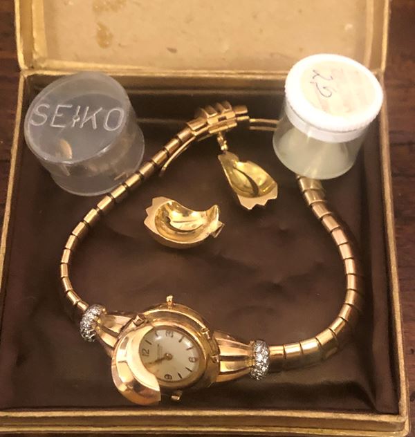 Lovely Lady watch bracelet an 18 kt yellow gold round shape and decorated with 0,30 carats of brilliant cut diamonds, Manual winding movement, and white dial, nice bracelet with a beautiful clasp deployante signed. "Melerio" signature on the back.