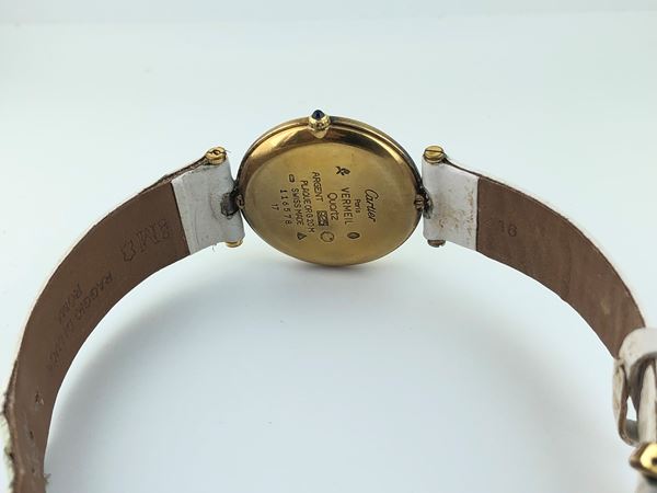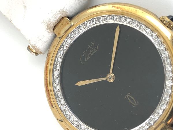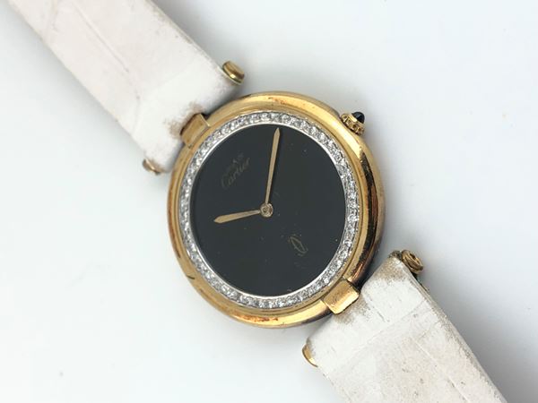 A well-preserved wristwatch in vermeil and diamond set by Cartier ( Good quality brilliant-cut diamond ), round shape, quartz movement, black dial, original buckle signed