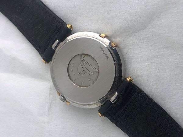 A very well-preserved wristwatch in stainless steel and gold, round-shape, with beautiful bezel in gold engraved with <black rabic numerals, white dial with two subsidiary dials