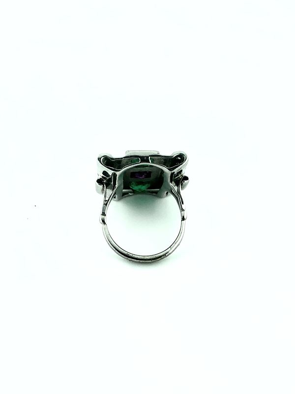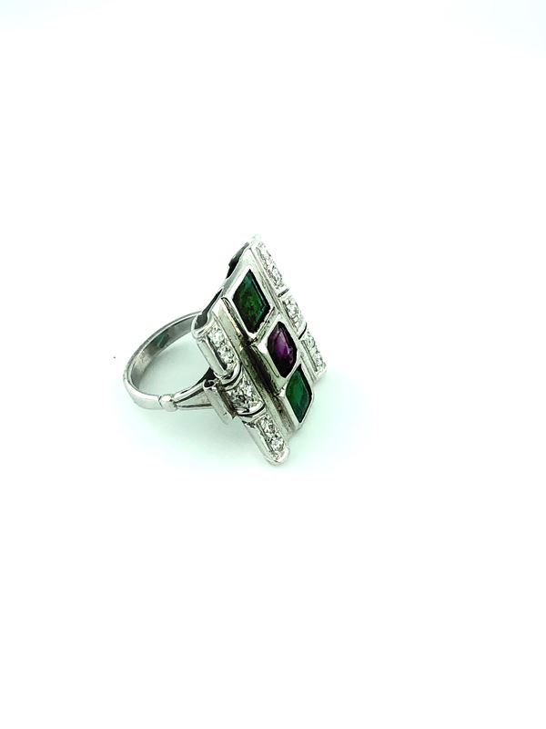 In 18 kt white gold set with two emeralds and one ruby decorated with brilliant-cut-Gross weight 9,1 grams dimensions 2 cmm x 2,5 cm