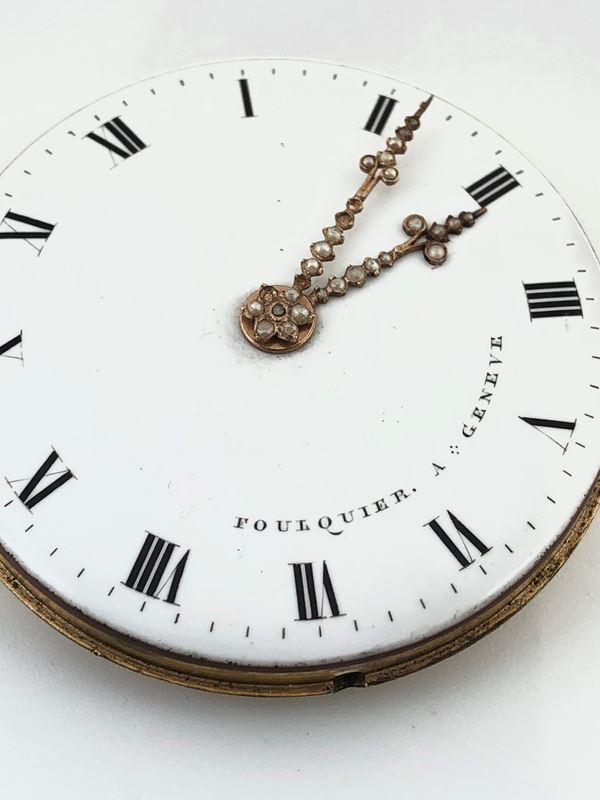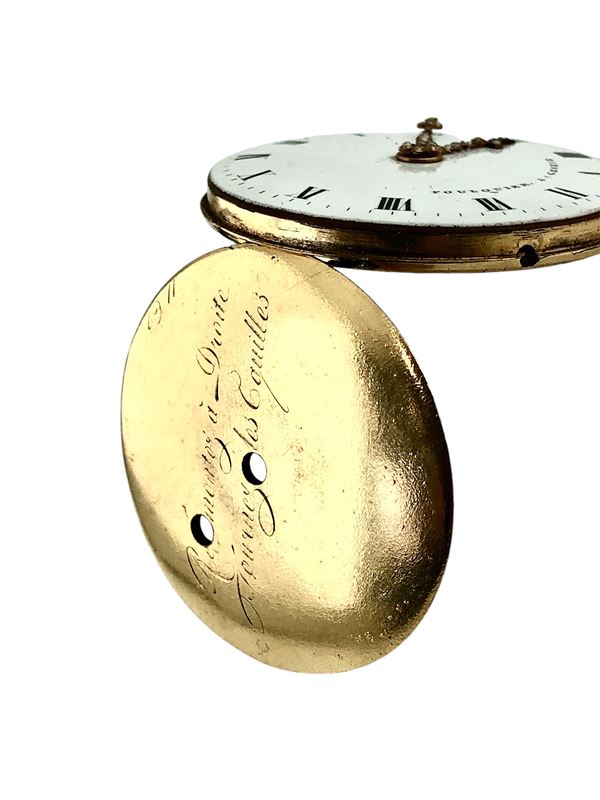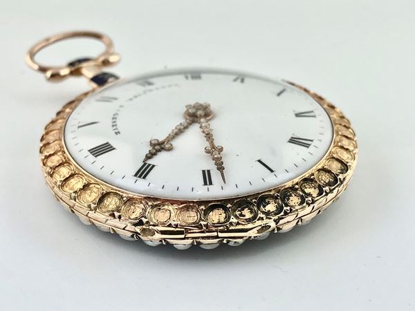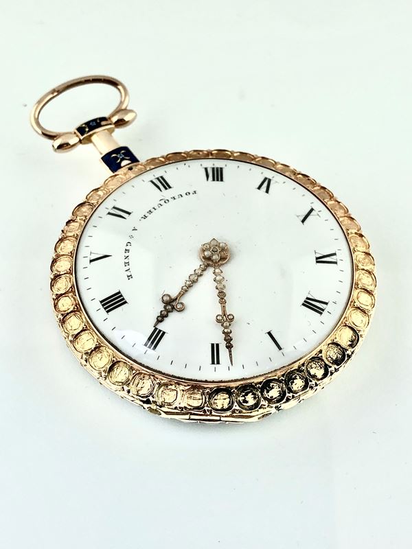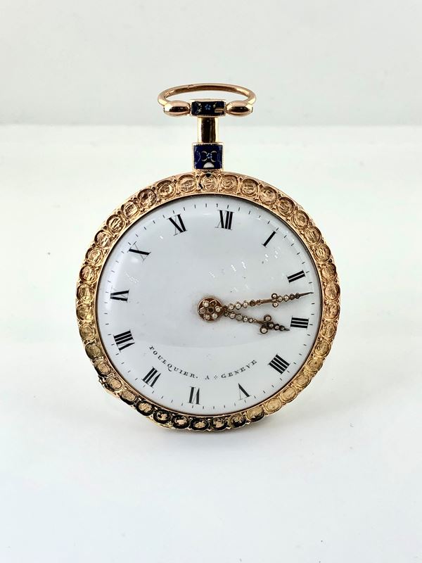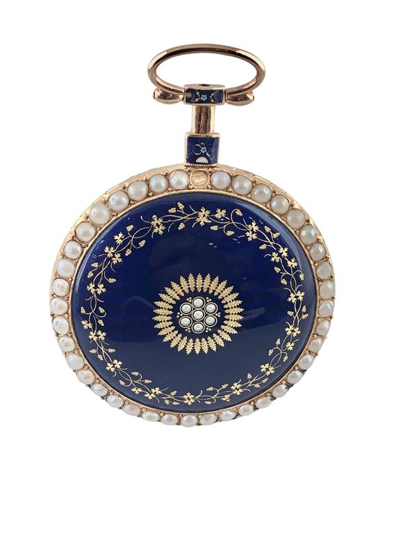 Fine and rare open-face enamel pocket watch in yellow gold with split pearls. The beautiful case is decorated in blue and ornamental motifs, accompanied by its nice chatelaine with key.