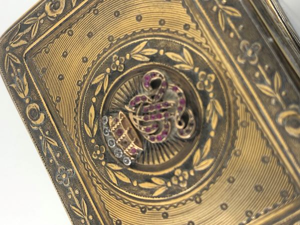 A fine desk clock with a rectangular shape in vermeil, fully engraved with ornamental motifs and embellished with a heraldic emblem, symbolizing tradition and heritage, mechanical movement, and a white dial with Arabic numerals and hour markers.