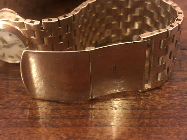 An attractive lady watch bracelet in yellow gold 18 kt round-shape, manual-winding movement, white dial with Arabic numerals hour markers alternated, nice turban bracelet with clasp deployante signed