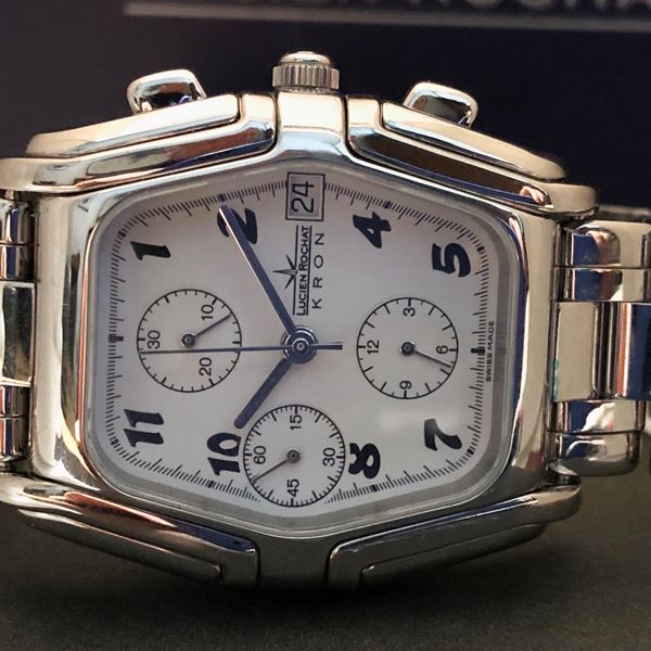 A very well-preserved stainless steel chronograph, back secured by screws, automatic movement, white dial Breguet numerals hour markers, date aperture at 3, 3 subsidiary dials, original bracelet with folding clasp deployante signed.