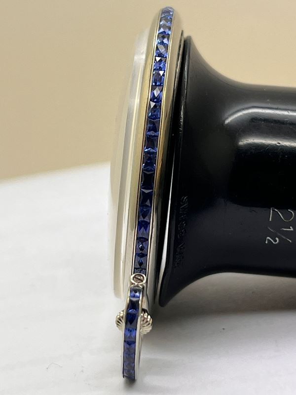 Very attractive Dress pocket watch in platinum decorated with calibrated sapphires, round shape, case snap on the back, manual winding movement, silvered dial with Breguet numbers applied in platinum, subsidiary dial for seconds at 6.