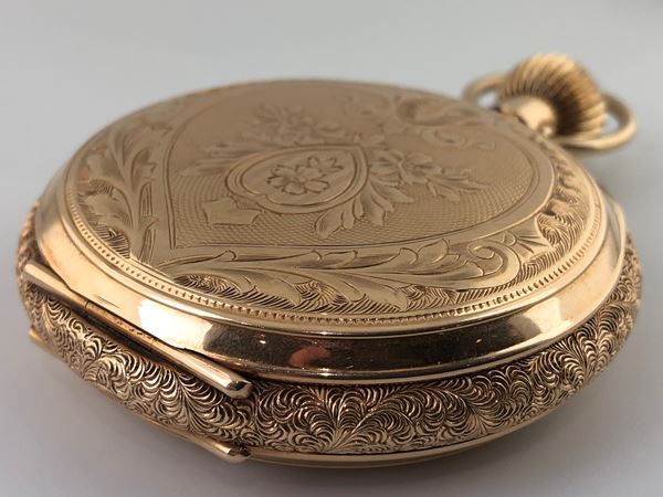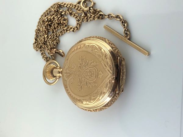 A very well-preserved three-body pocket watch " Savonette" in 14 kt yellow gold with its original chain,