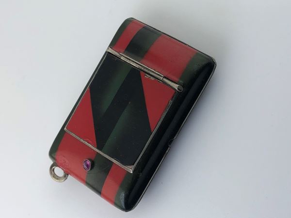 A fine travel desk watch, case covered by enamel polychrome, white dial with Arabic numerals hour markers, and manual winding movement.Dial signed Dimensions 4,5 cm x 3,5 cm Not working state needs to be revised