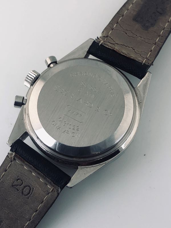 A rare chronograph in stainless steel, case snap-on back, manual winding movement, black dial with three white subsidiary dials, date aperture at 3.