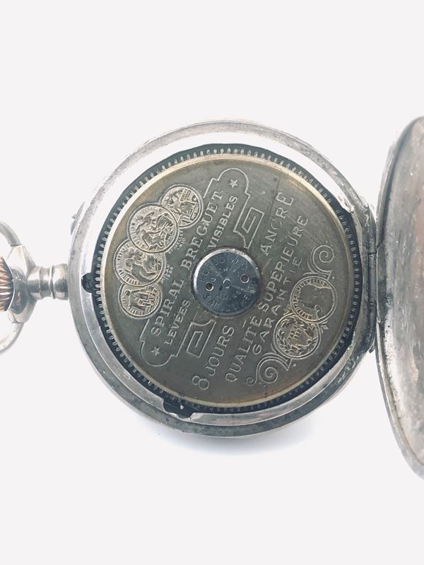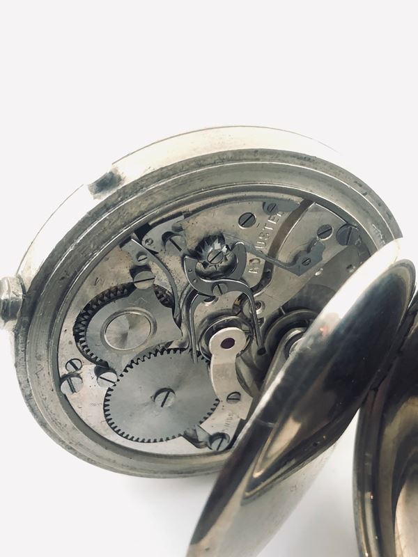 Silver pocket watch, manual winding movement, white porcelain dial, with Black arabic numeral hour markers.
