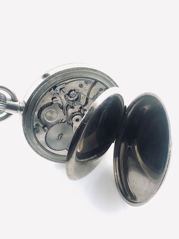A stainless steel pocket watch with chronograph function, manual winding movement, white dial with black index, subsidiary dial at 12.