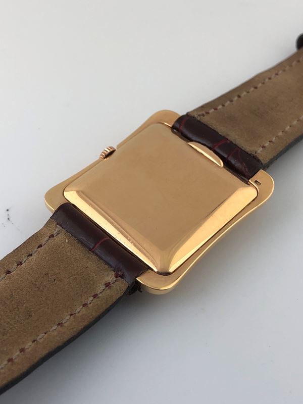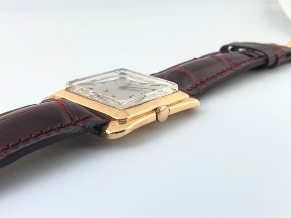 A rare and well-preserved wristwatch in 18 kt yellow gold, square-shape, case snap on back, manual winding movement, white guilloché dial with baton and Arabic numerals alternated applied, subsidiary seconds dial.