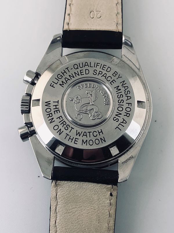 A very well-preserved chronograph in stainless steel, case back screwdown, manual winding movement, black dial with luminous baton hour markers, three subsidiary dials, bezel in good condition, original buckle signed