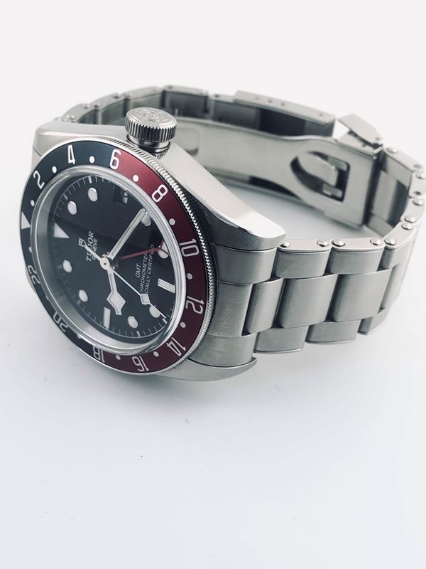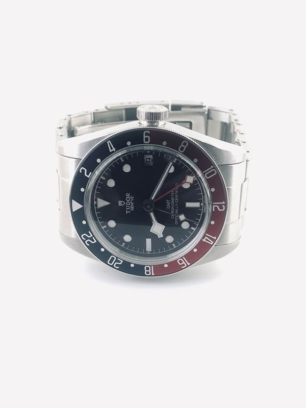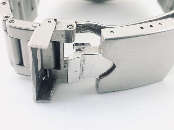 A stainless steel diver watch, with GMT bezel, case screw down, self-winding movement, black dial with luminescent dot hour markers, date aperture at 3, flip lpck oyster bracelet with clasp deployante signed