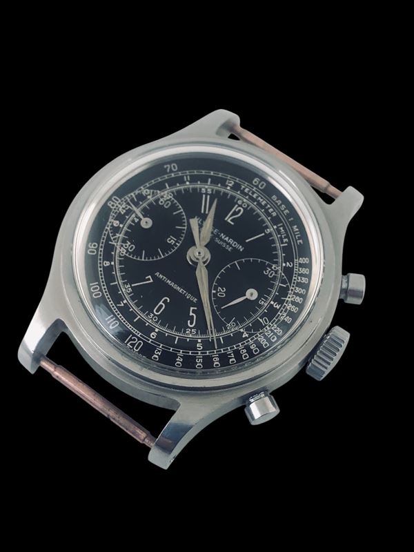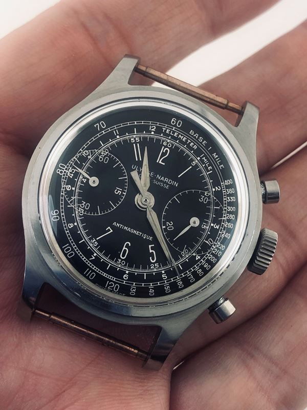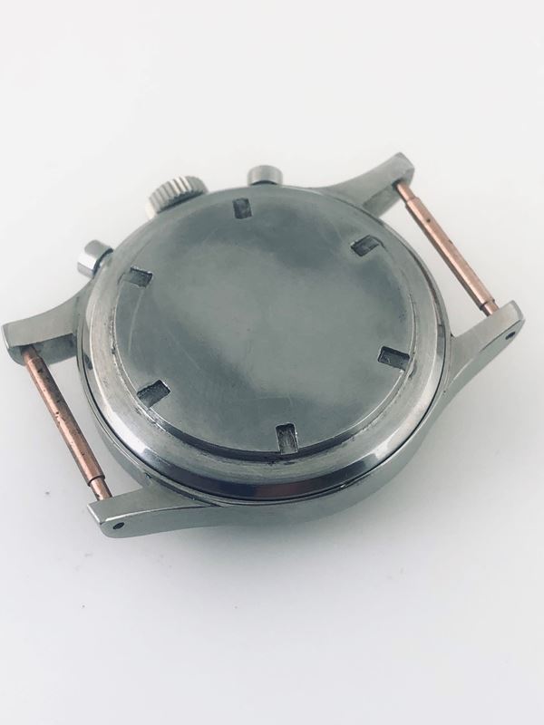 A well-preserved stainless steel chronograph, round shape, case back screw down, manual winding movement, black dial with luminous Arabic numerals hour markers, two subsidiary dials. Dial, case and movement signed