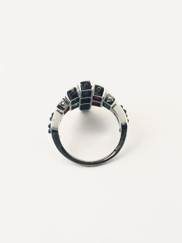 In 18 kt white gold, with a triangular shape design, set with sapphires, rubies and emeralds
