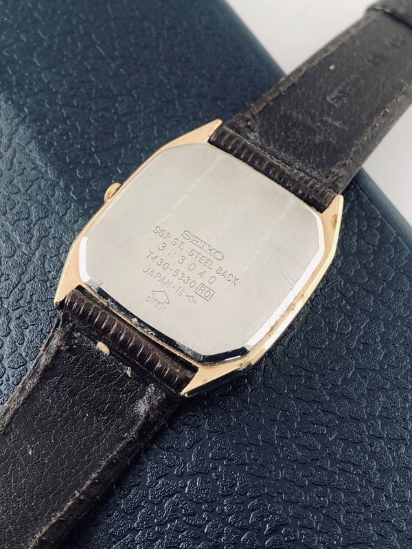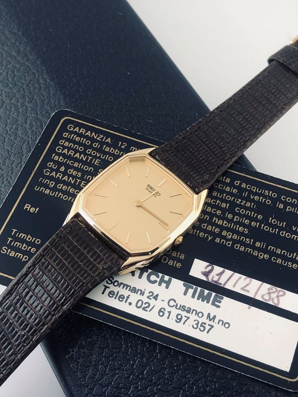 A goldfield watch rectangular shape, quartz movement, champagne dial with baton hour markers, date aperture at 3, original strap with buckle signed