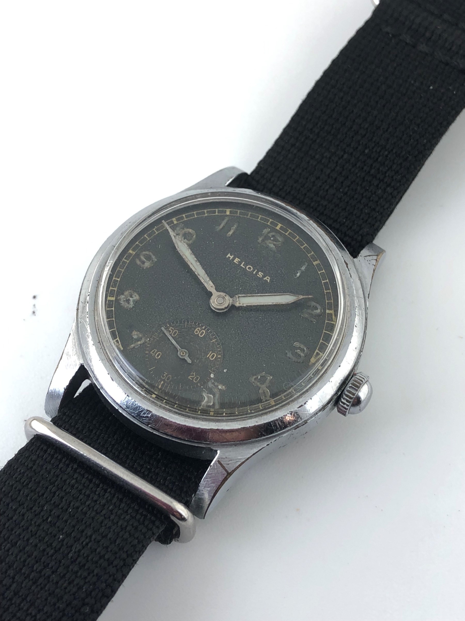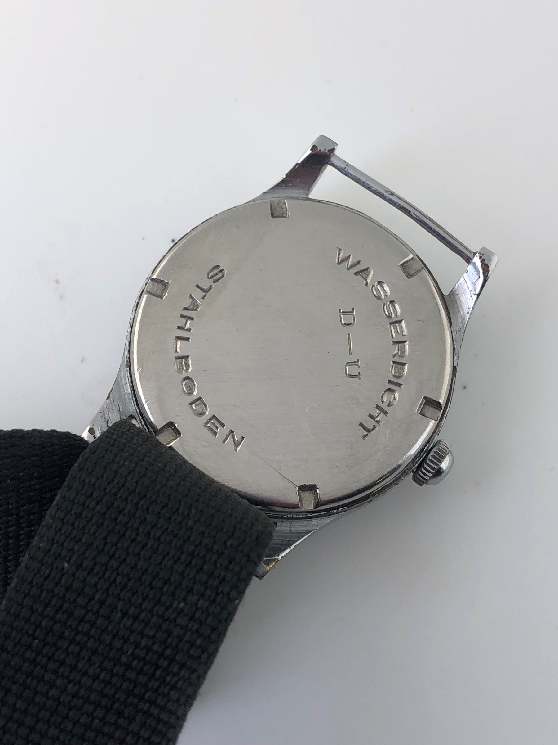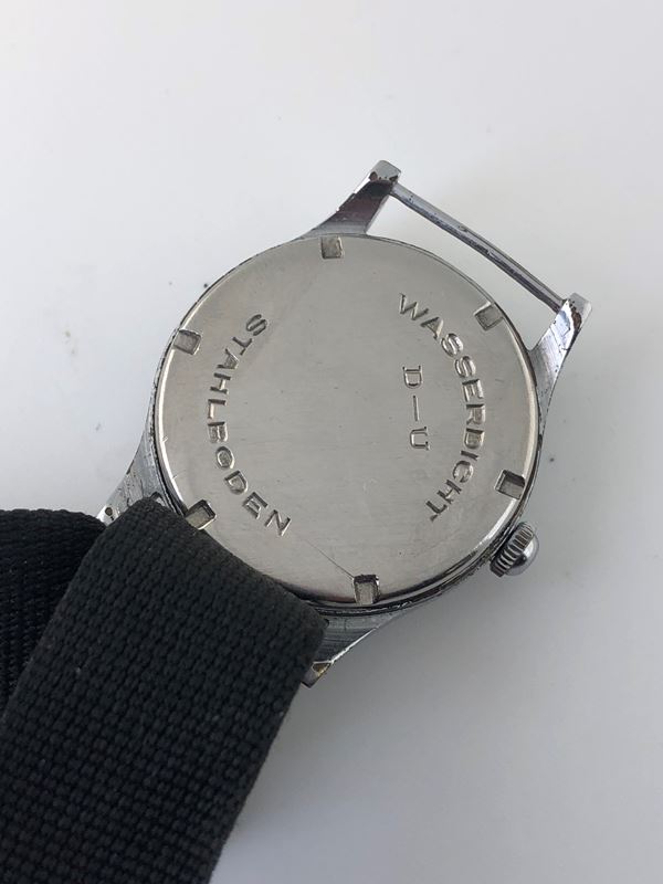 An interesting Military watch in stainless steel, with a case screw down, manual winding movement, and a black dial with luminescent Arabic numerals and hour markers