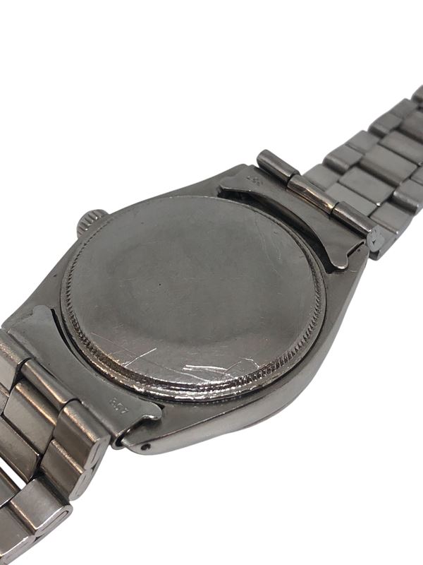 A rare stainless steel oyster case, round-shaped, with a self-winding movement, black dial with luminescent Arabic numerals 3,6,9, Oyster original bracelet with clasp deployante signed.