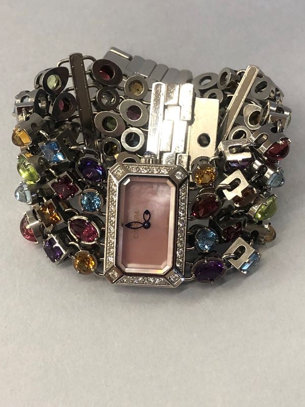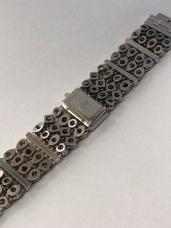 A lady's watch in stainless steel, rectangular shape, case back secured by screws, quartz movement, nacre dial, bracelet composed of rows set with colored gems, clasp deployante signed