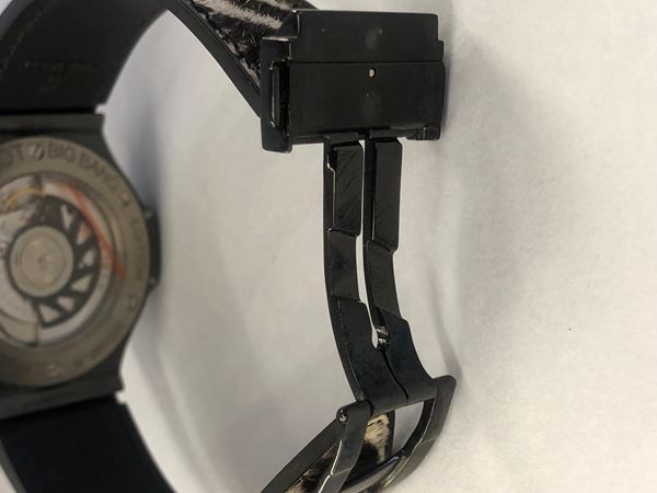 Self-winding movement, dial decorated in white and black, date aperture at 3, original strap with folding clasp deployante signed