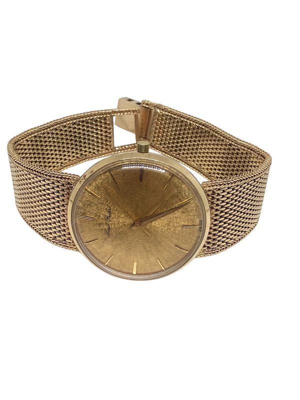 A gold 14 kt watch bracelet, round shape, case snap-on back, manual winding movement, champagne dial with baton hour markers applied, gold integrated bracelet with folding bracelet.