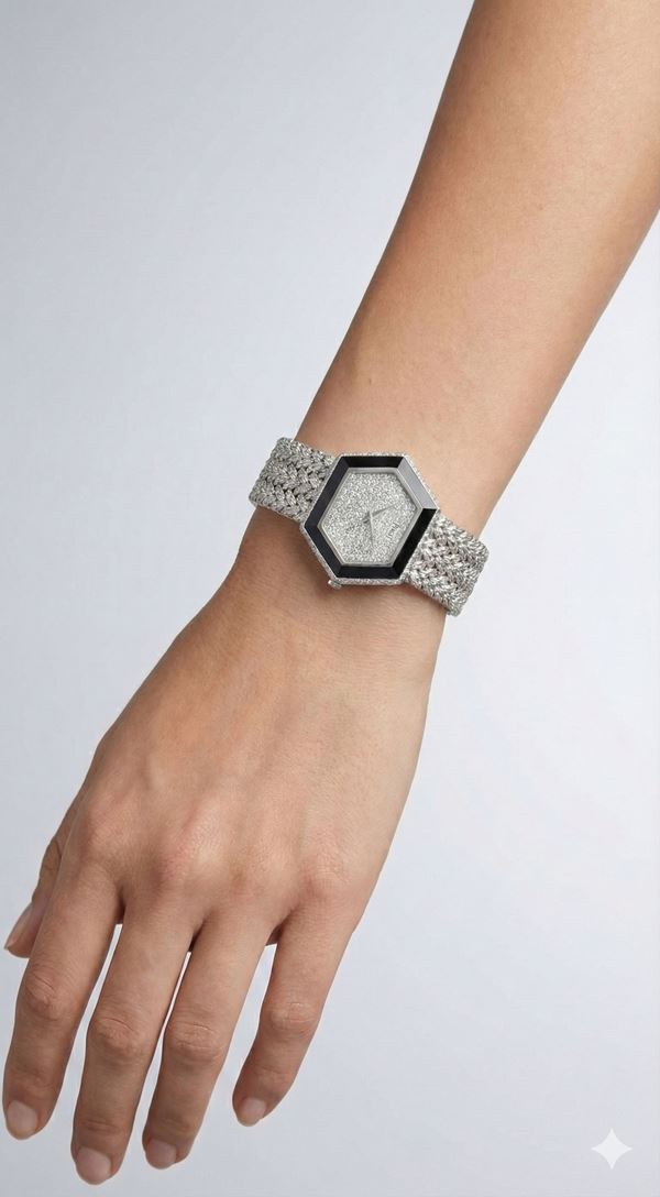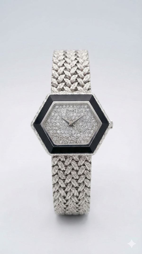 A very well-preserved and rare Lady watch in 18 kt white gold, hexagonal shape with nice bezel,