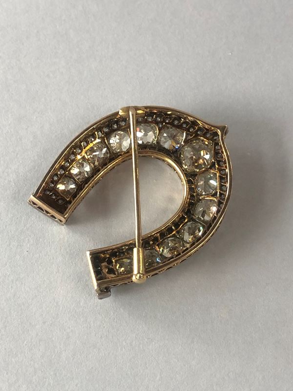 An elegant and very rare brooch in silver and gold shapes in a horseshoe set with 10 carats of old-cut diamonds