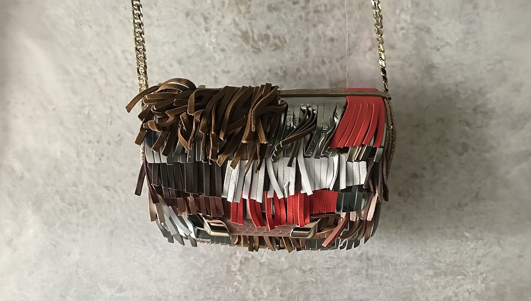 In leather decorated with multicoloured fringes in suede, signed