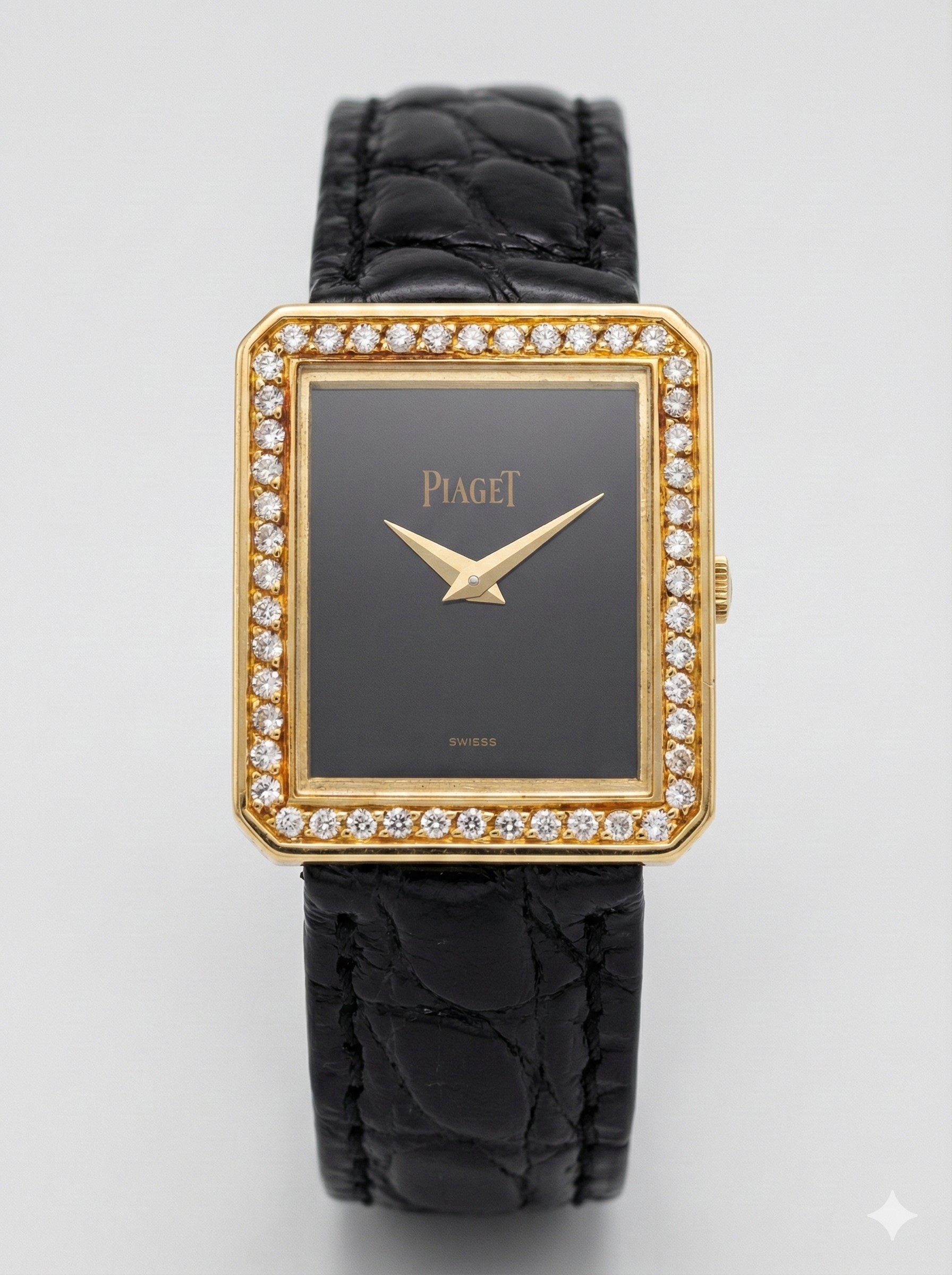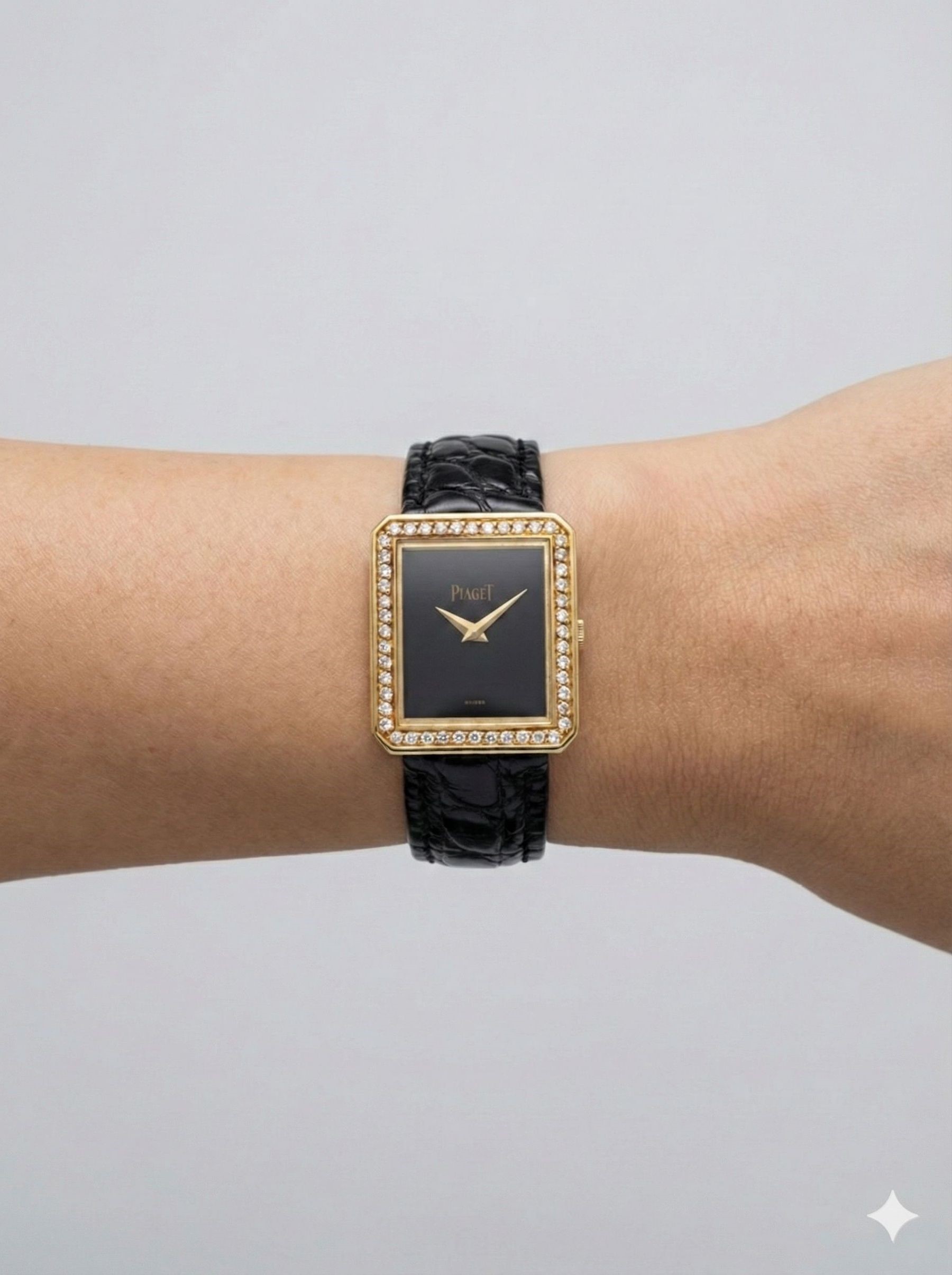 An 18 kt yellow gold watch, rectangular shape, diamond bezel, black dial, manual wind movement, original bracelet with buckle in gold 18 kt signed.