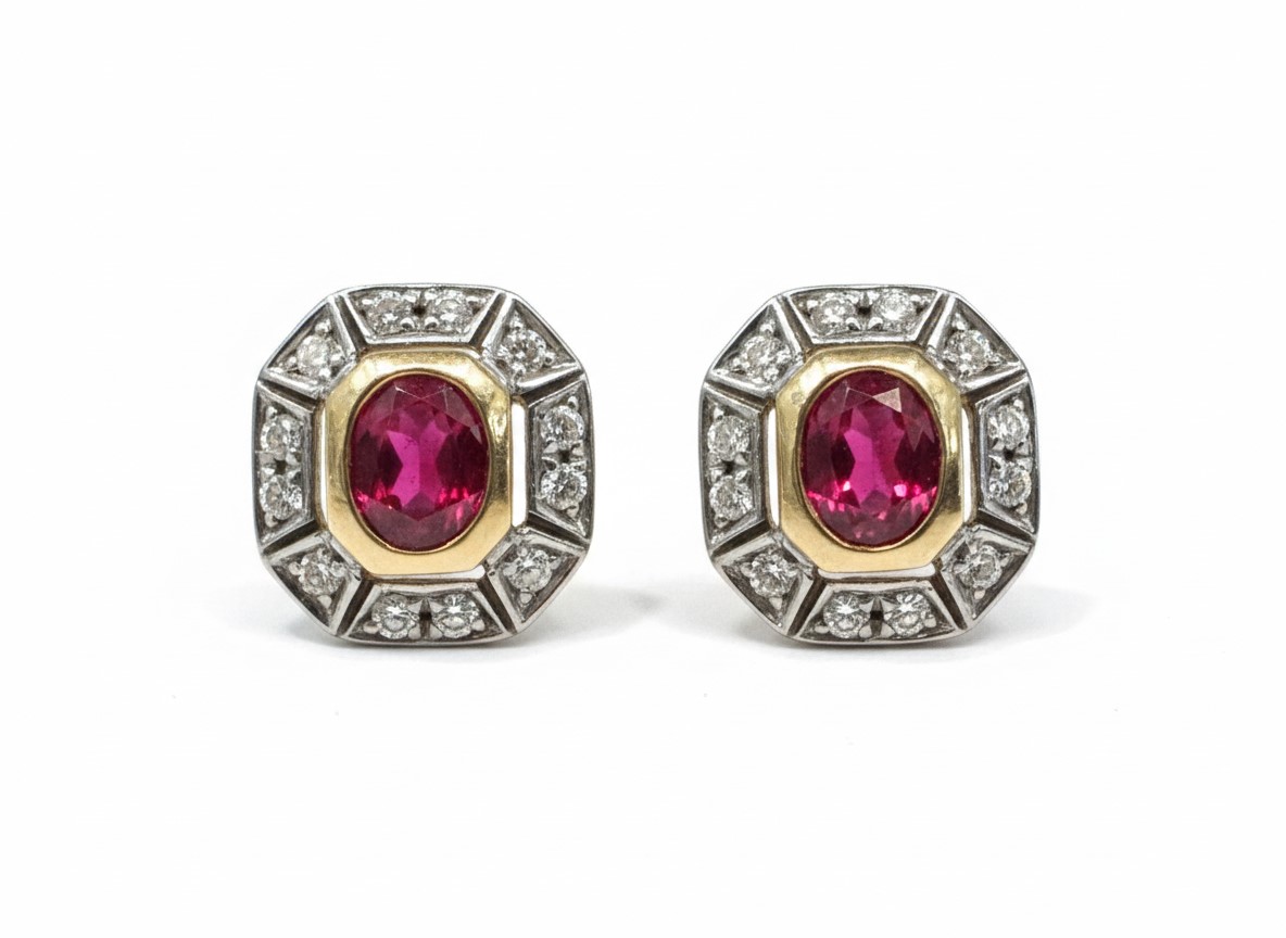 striking pair of bi-colour stud earrings, each featuring a vibrant oval-cut ruby set within a polished yellow gold collet. The central stones are framed by a geometric, octagonal border of round brilliant-cut diamonds set in white metal.