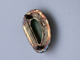 A decorative brooch set with a carved green agate plaque, showing natural veining and pierced decoration, mounted in a silver frame with gold accents, enriched with scrolling and rope-twist detailing.
