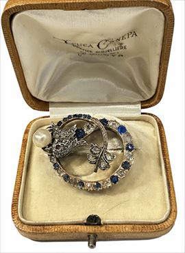 ART DECO SAPPHIRE, DIAMOND AND PEARL BROOCH, CIRCA 1930
