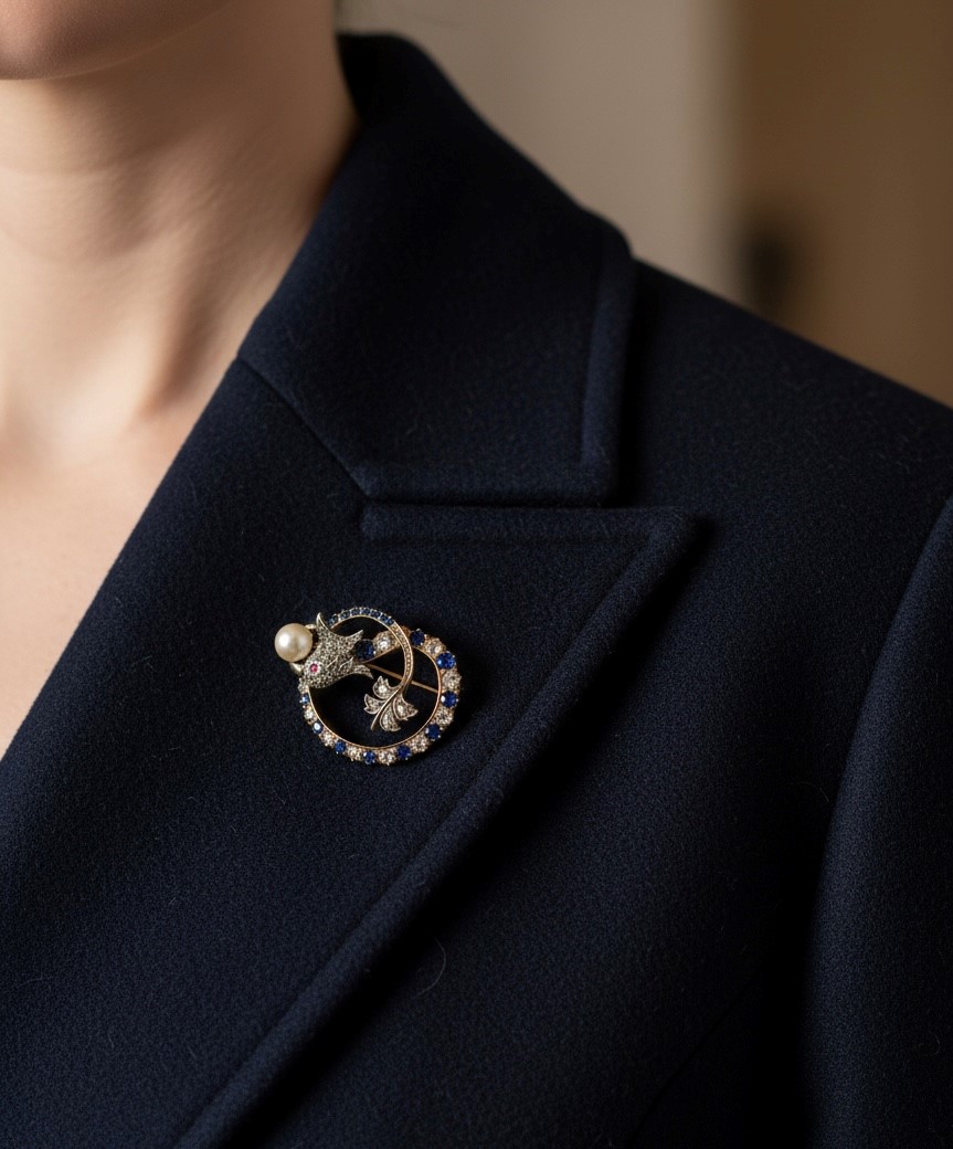 Design: A circular frame set with alternating round-cut sapphires and colourless stones (likely diamonds or white sapphires), centring an articulated floral spray.