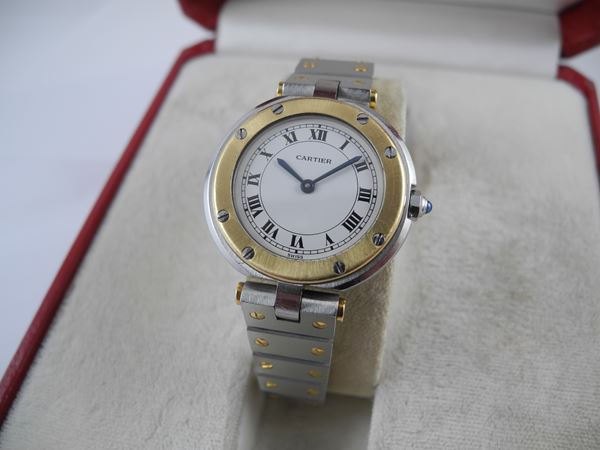 Stainless steel case with 18 ct yellow gold bezel, quartz movement.silvered Roman numeral dial, blued steel hands and cabochon-set crown, on a bi-metal bracelet.