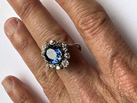White gold ring set with an oval blue gemstone, surrounded by old-cut diamonds totalling approximately 0.25 carats. Elegant vintage-style design with a delicate tapered band.