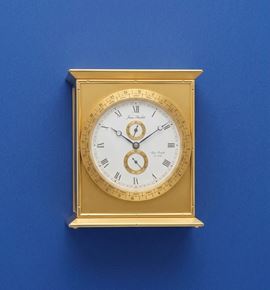 A fine Swiss-made gilt-brass desk timepiece featuring international complications